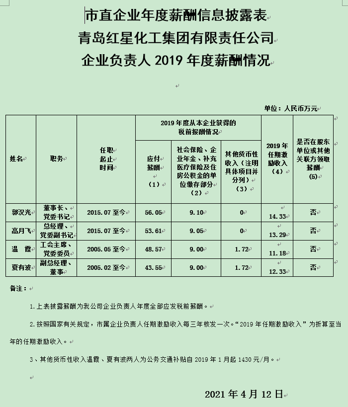【概要(yao)描(miao)述】青島紅星(xing)化工集團有限責任(ren)公司(si)企(qi)業負責人(ren)2019年度薪(xin)酬情況信息(xi)披露(lu)